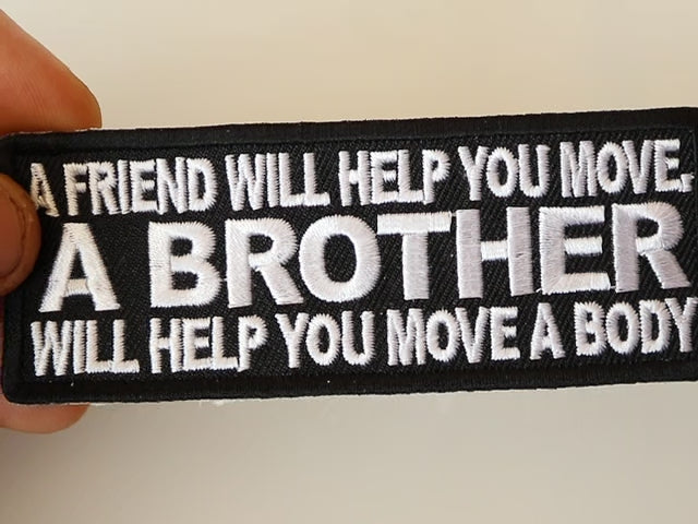 Express your sense of loyalty and humor with the "A Friend Will Help You Move, A Brother Will Help You Move a Body" Patch by Patch Tripper. Perfect for those who believe in unbreakable bonds, this patch captures the unique camaraderie shared between close friends and family. Designed in classic black and white, this patch is an ideal addition to biker jackets, vests, hats, and other gear.