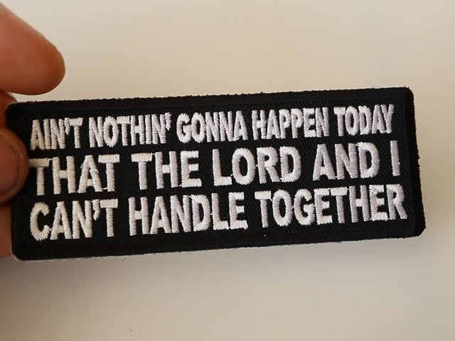 The Ain't Nothing Gonna Happen Today That The Lord and I Can't Handle Together Christian Patch serves as a comforting and empowering reminder of faith. Measuring 4 x 1.5 inches, this patch features the uplifting message in black and white embroidery.