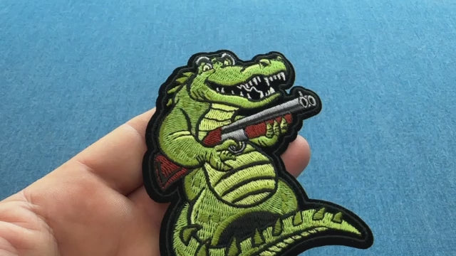 The Alligator Shotgun Patch is a fun and unique patch that stands out for its creative design. Measuring 3.2x4 inches, it features a not-so-menacing alligator with a playful expression holding a shotgun, a humorous take on classic personification. With various shades of green, this embroidered patch is vibrant and sure to draw attention when sewn or ironed onto any jacket or vest.