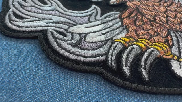 The American Flag Eagle Patch is a striking, large-sized embroidered design that exudes patriotism and strength. Featuring a powerful eagle with outspread brown wings against a backdrop of the American flag, this patch brings bold symbolism and intricate artistry to any jacket, vest, or shirt. Ideal for the back of leather riding jackets or denim jackets, this patch is a true attention-grabber and a proud emblem of American spirit.