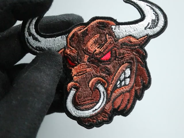 Add a fierce statement to your attire with the Angry Bull Iron-On Patch. This patch measures 4 x 3 inches and features a striking design of a brown bull with intense red eyes, a silver nose ring, and a mischievous grin, showing a hint of teeth. The detail in the expression and colors captures the bull's bold personality, making this patch perfect for those who love edgy and powerful designs.