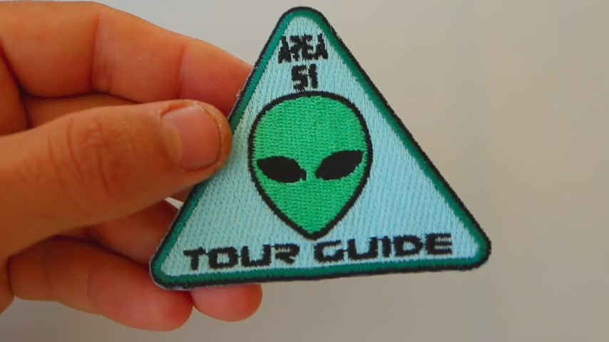 The Area 51 Tour Guide Funny Iron-On Patch features a quirky alien head design with a humorous twist, perfect for sci-fi enthusiasts or those who enjoy adding a playful touch to their outfits. Measuring 3.5x3.5 inches, it is crafted on durable twill fabric with clean cut embroidered borders for easy sewing or ironing onto clothing.