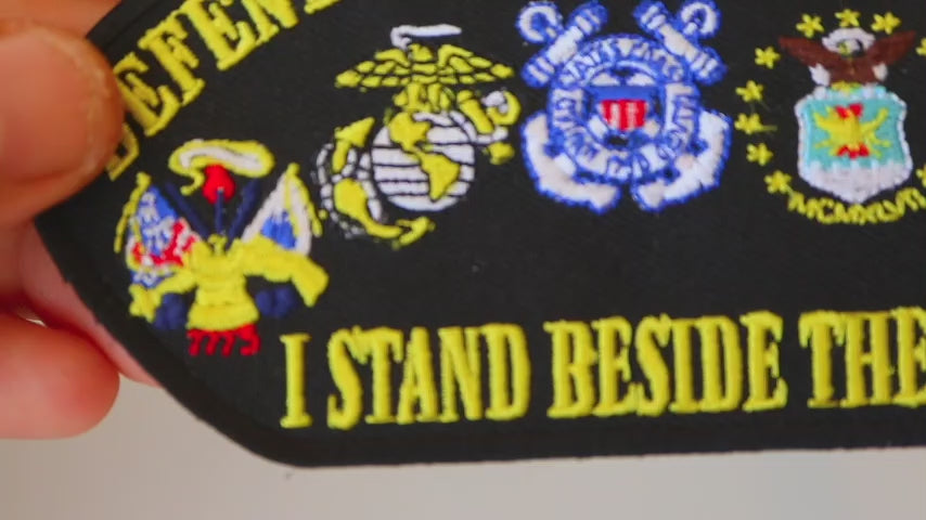Express your unwavering support for the brave men and women of the armed forces with the Defenders of Our Freedom Patch: I Stand Beside Them. Measuring 5 x 2.75 inches, this embroidered patch showcases the logos of the US Army, Marines, Coast Guard, Air Force, and Navy, encapsulating the essence of patriotism and unity.