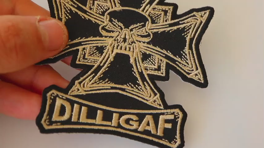 - Patch Style: Artwork with text ("Dilligaf") alongside a skull and cross design