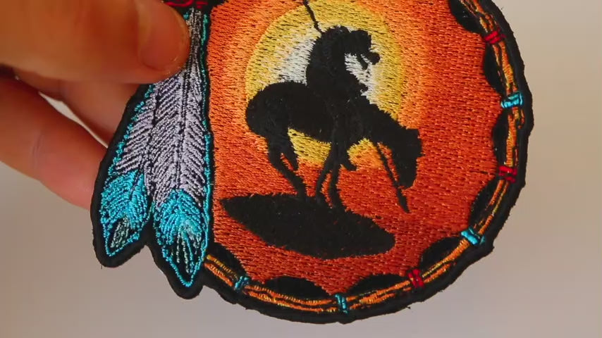 The End Of The Trail Small Patch measures 3.5 x 3.5 inches and features a rich, colorful design with beautiful feather embroidery, capturing a classic style statement. This embroidered patch is vibrant with colors like black, red, yellow, turquoise, and white, making it stand out on any garment. The velvet fabric adds a soft, luxurious feel, while the clean-cut die borders make sewing an effortless task.