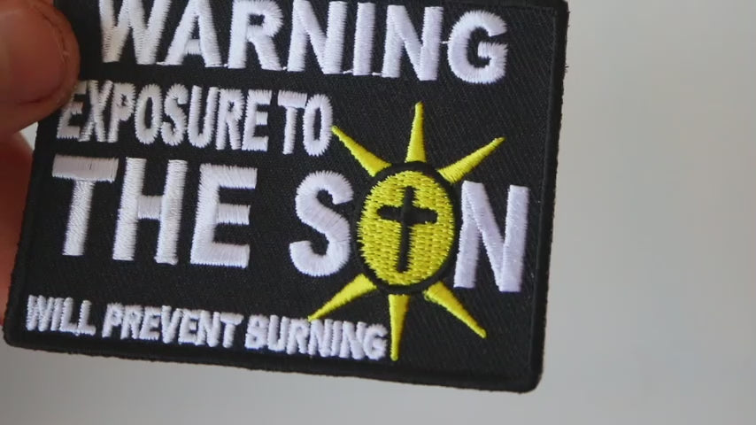 Patch Description: The Exposure To The Son Christian Patch features a bold, eye-catching design that combines a powerful message with striking visuals. The patch, measuring 3x2 inches, is embroidered with white and yellow threads over a black background, with rays of sunshine emanating from the letter "O," which contains a cross. The text "Warning exposure to the Son will prevent burning" adds a playful yet meaningful touch to the design.