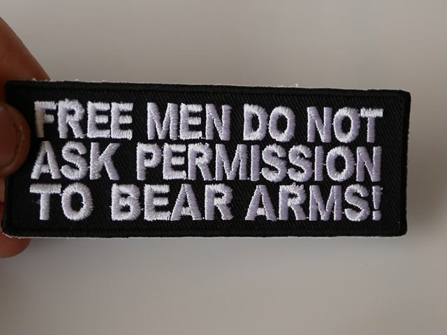 Make a statement with the Free Men Don't Ask Permission to Bear Arms Patch. This bold patch, measuring 4 x 1.5 inches, features the powerful phrase embroidered in white on a black background, perfect for those who believe in the right to bear arms.