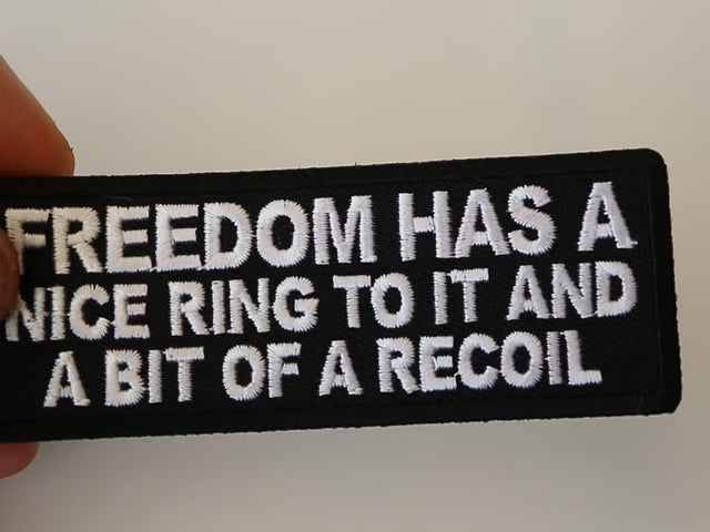 Express your spirited individuality with the "Freedom Has a Nice Ring To It and a Bit of a Recoil" Patch. Measuring 4x1.5 inches, this patch features a striking black and white design that boldly showcases your passion for freedom and self-expression.
