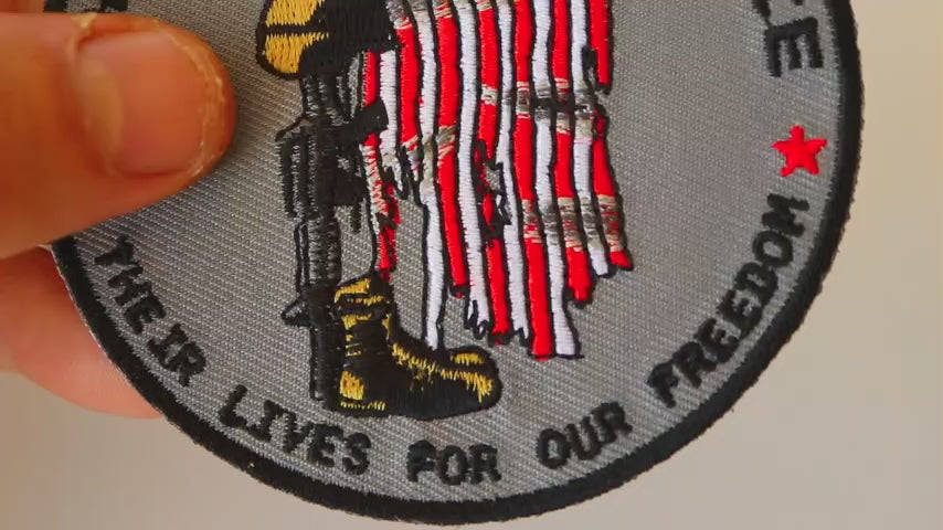 The Honor Their Sacrifice Memorial Patch is a beautifully designed tribute measuring 3.5 x 3.5 inches. Embroidered in a striking combination of black, gray, red, white, and blue, this patch serves as a heartfelt reminder of the sacrifices made by our heroes.