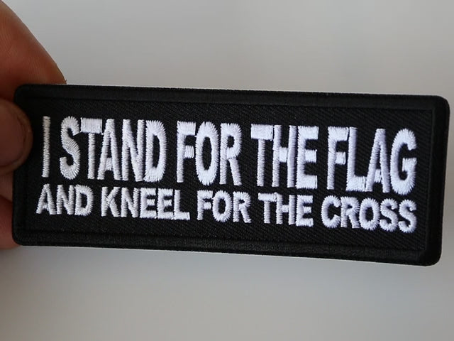 The "I Stand For The Flag And Kneel for The Cross" patch measures 4x1.5 inches and is embroidered in a striking Black and White color combination. This small patch can be sewn or ironed onto clothing such as denim or leather jackets, vests, hats, backpacks, and shirts. It features plastic backing and clean, embroidered die-cut borders.