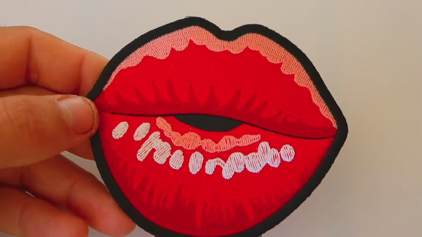 The Lips Blowing a Kiss Iron-On Patch is a flirty and fun addition to your collection. Measuring 3 x 2.5 inches, it features a pair of luscious red lips with a playful kiss blowing detail, embroidered with precision on a soft velvet backdrop.