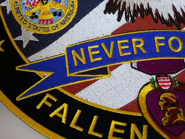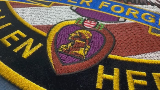 The backdrop is adorned with an American flag, lending a sense of patriotism, while the banner NEVER FORGET gracefully stretches below the eagle. Encircling the patch is the solemn phrase, "In Memory of those who made the ultimate sacrifice," along with a Purple Heart emblem at its center, reminding us of the true cost of freedom.