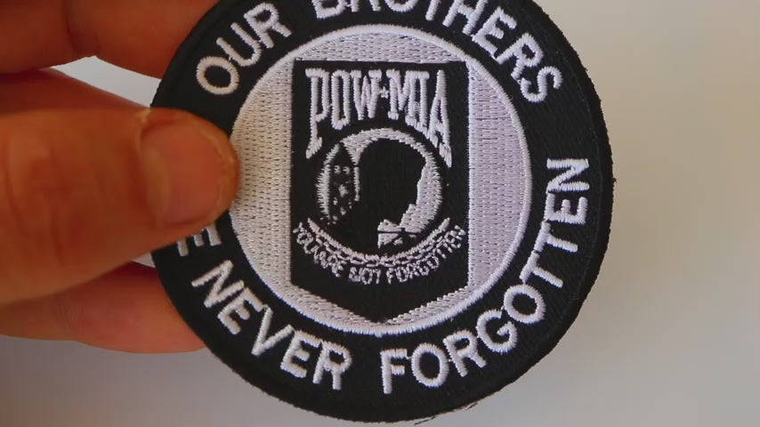 The Our Brothers Are Never Forgotten Patch is a poignant tribute to the courage and sacrifice of our military veterans. This round-shaped patch, measuring 3 inches, features the iconic Prisoner of War (POW) symbol at its center, surrounded by the heartfelt message "Our Brothers Are Never Forgotten."