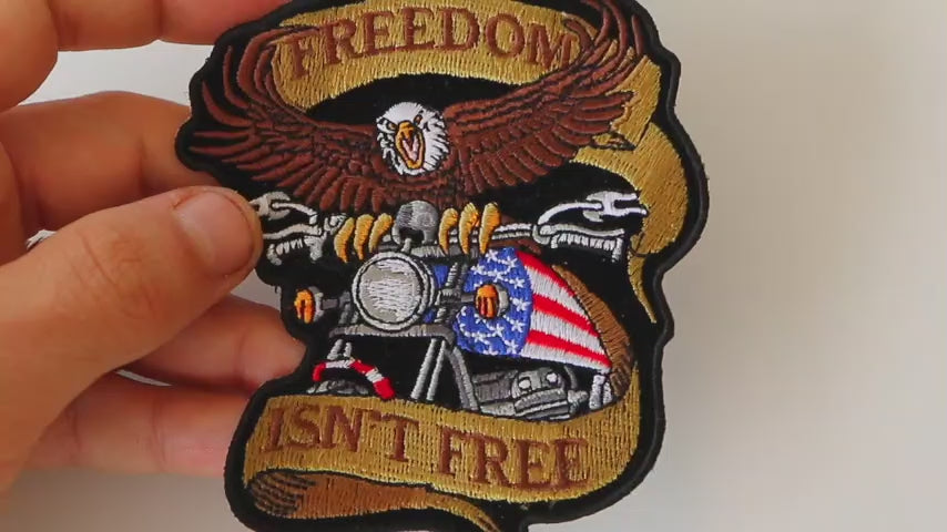 Celebrate your patriotism with the Patriotic Eagle Biker Patch emblazoned with the powerful message, "Freedom Isn't Free." Measuring 3.75 x 4.25 inches, this striking patch showcases a beautifully embroidered eagle in vibrant colors of red, white, blue, black, brown, and gold. It serves as a tribute to the brave individuals who protect our freedom and the sacrifices they make.