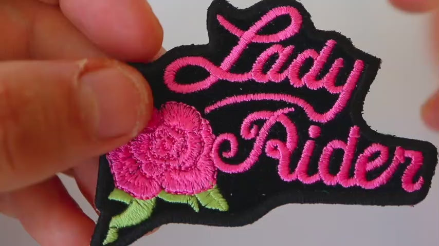 - Patch Style: Artwork with text (Lady Rider roses design)