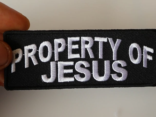 Property of Jesus Christian Patch Description: The Property of Jesus Christian Patch boldly displays the message "Property of Jesus," proclaiming one's faith and dedication. The patch is embroidered with text in black and red against a white background, making it an eye-catching and meaningful accessory for any garment.