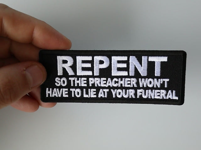 Repent so the Preacher Won't Have to Lie at Your Funeral Patch Description: This funny Christian iron-on patch delivers a witty yet meaningful message: "Repent so the Preacher Won't Have to Lie at Your Funeral." Measuring 3x2 inches, this humorous patch is perfect for those who appreciate a good laugh while still maintaining a connection to their faith. The design features bold black and white text with a touch of yellow, making it both eye-catching and easy to read.