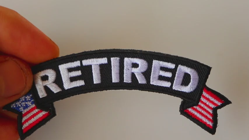 This 4-inch wide arched rocker patch has "RETIRED" embroidered in white over a black background with American flag tips. It can be sewn or ironed on and goes well on top of our 3-inch wide military patches if you are retired from the US Military.