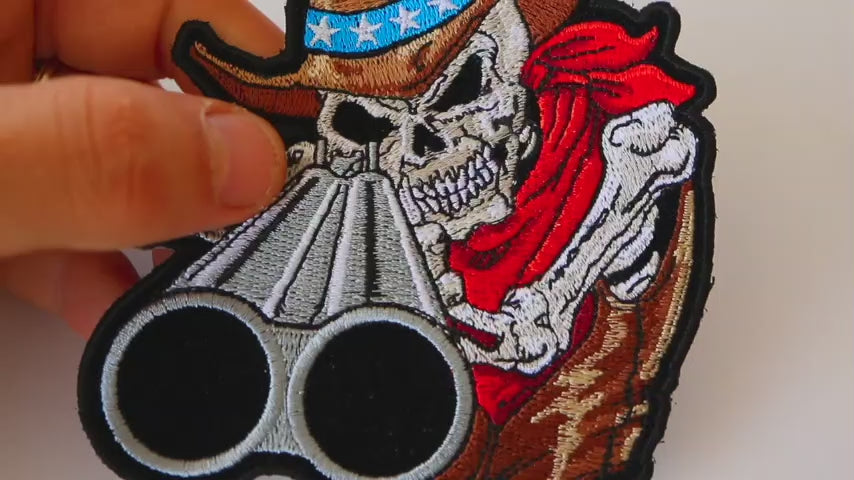 The Shotgun Skull Cowboy Patch is a bold and striking embroidered patch measuring 4 x 4 inches. This design features a skull with a cowboy twist, embroidered in a rich mix of colors including gray, red, brown, blue, and black. Its detailed artwork adds an edgy flair to denim jackets, leather vests, hats, and backpacks.