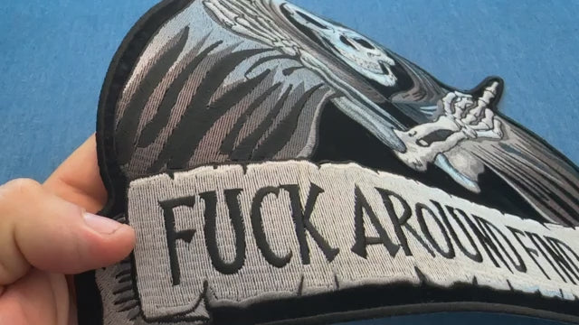 The Skull Reaper "Fuck Around Find Out" Patch is a bold and edgy design that measures a substantial 5 x 5 inches. Embroidered in a mix of black, white, and gray, this patch features a detailed skull reaper design paired with the intense phrase "Fuck Around Find Out."