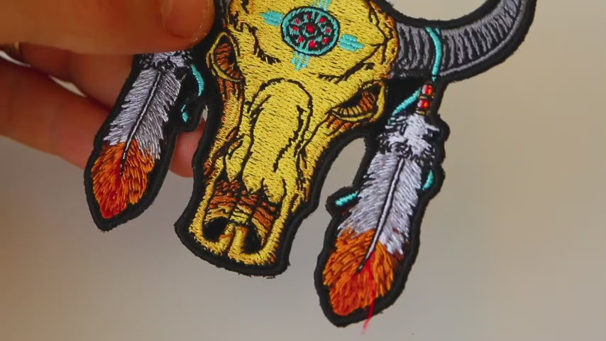 The Small Buffalo Head Feathers Patch features a beautifully embroidered buffalo head with feathers in vibrant colors like black, yellow, white, turquoise, and red. Measuring 3.5 x 3.5 inches, this patch makes a bold statement on jackets, backpacks, hats, or other items.