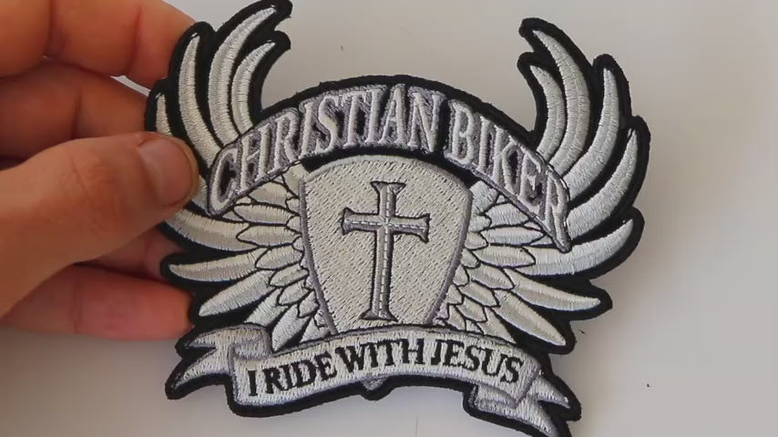 Small Christian Biker Patch: I Ride With Jesus brings a meaningful message to the biker community. Its silver and white embroidery offers contrast and visibility, while the velvet fabric gives it a unique, high-quality feel. This patch is a great way to express both faith and passion for biking. The clean embroidered borders ensure durability, and the message makes it a meaningful choice for Christian bikers looking to make a statement. It’s a fantastic addition to any rider’s jacket, combining spirituality with biker culture in a visually striking way.