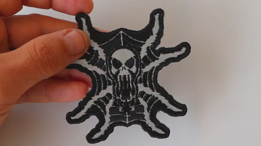 The Spider Skull Reflective Iron-On Patch is a bold and eye-catching design, measuring 3.5x3.4 inches. It features a spider and skull graphic that pops with black and reflective colors, providing excellent visibility in low light conditions. Perfect for jackets, vests, or any other apparel, this patch is designed with embroidered die-cut borders that allow for easy sewing.
