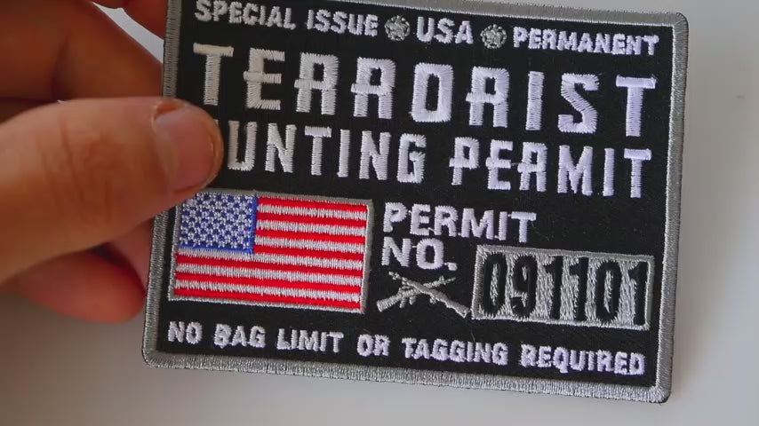 Add a touch of humor to your military gear with the Terrorist Hunting Permit Patch. Measuring 3.75x3 inches, this patch features an eye-catching design in bold black, white, red, and blue gray colors. Perfect for denim or leather jackets, vests, hats, backpacks, and shirts, this versatile patch can be easily sewn or ironed on, thanks to its durable plastic backing and clean cut embroidered borders.