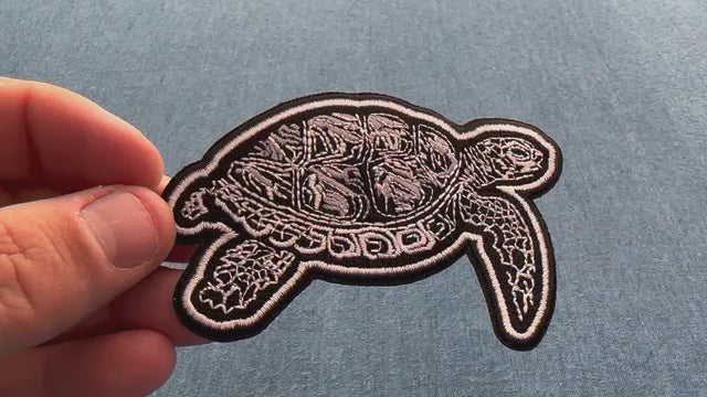 The Tribal Turtle Patch is an embroidered design measuring 4x 3 inches, showcasing a tribal-style turtle in black and gray. Ideal for biker jackets, vests, chaps, shirts, hats, or denim materials, this patch features plastic iron-on backing and laser-cut embroidered borders.