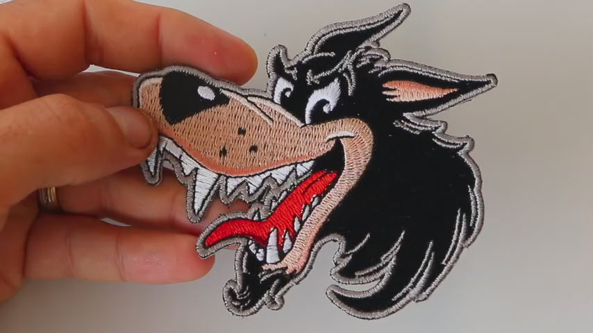 Add a bold touch to your wardrobe with the Small Cartoon Wolf Patch, designed by Arturo Vilmenay. This beautifully embroidered patch features a cartoon-style wolf in striking black, red, and gray hues, set on a luxurious velvet background.